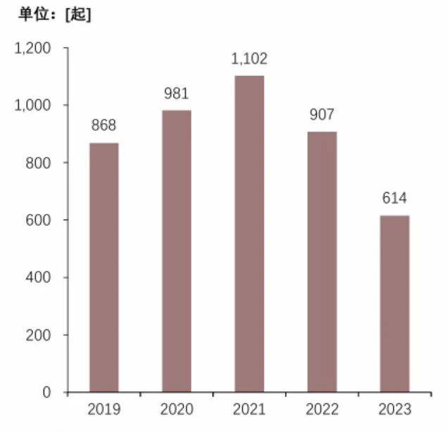 在政策引導(dǎo)下,“專精特新”領(lǐng)域吸引大量投資,投融資活躍度較高。截至2023年,4233家專精特新“小巨人”企業(yè)獲得戰(zhàn)略融資,309家企業(yè)獲得A輪融資。但仍有8536家企業(yè)未獲得融資,融資滲透率僅50%。從融資時間分布來看,2019—2021年融資事件逐漸增多,2021年達(dá)到1102次,之后熱度有所下降,2023年發(fā)生融資614次。未來提升融資滲透率,實現(xiàn)知識產(chǎn)權(quán)投融資全覆蓋是發(fā)展重點。