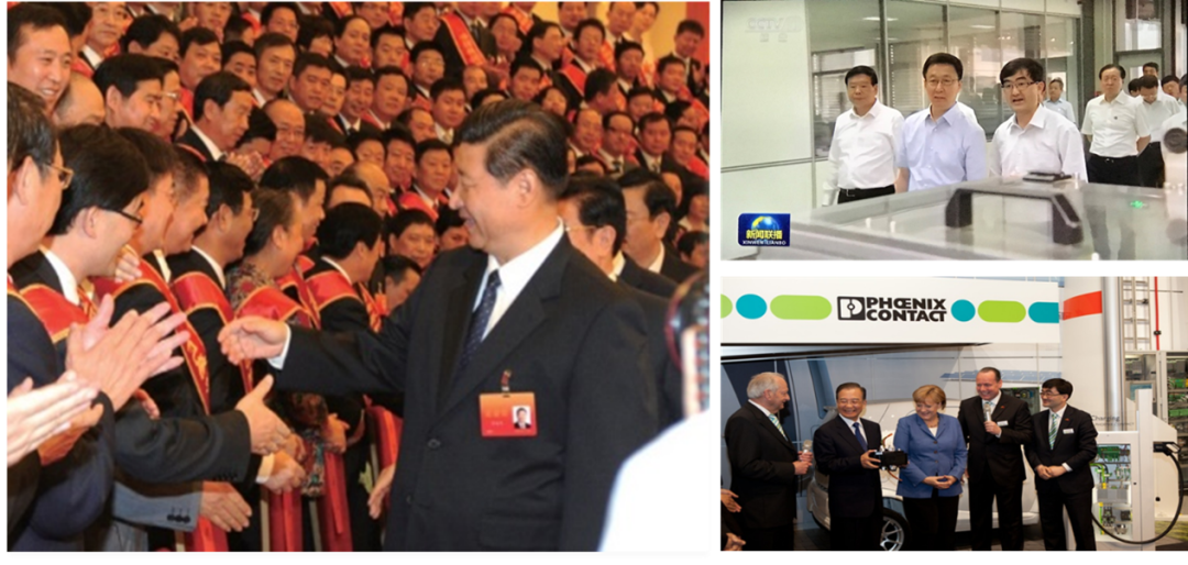 (左圖:公司被授予“全國模范勞動關(guān)系和諧企業(yè)“稱號,習(xí)近平等黨和國家領(lǐng)導(dǎo)接見中國公司總裁顧建黨先生;右上:韓正副總理蒞臨菲尼克斯電氣中國公司視察;右下:時任總理溫家寶和德國總理Angela Dorothea Merkel蒞臨菲尼克斯電氣展臺視察)