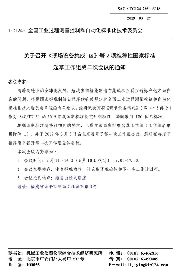 2019年6月11日-14日,由全國(guó)工業(yè)過(guò)程測(cè)量控制和自動(dòng)化標(biāo)準(zhǔn)化技術(shù)委員會(huì)發(fā)起的《現(xiàn)場(chǎng)設(shè)備集成》(第 4~5部分《現(xiàn)場(chǎng)設(shè)備集成包》和《現(xiàn)場(chǎng)設(shè)備集成信息模型》)等兩項(xiàng)國(guó)家智能制造標(biāo)準(zhǔn)第二次會(huì)議在福建順昌虹潤(rùn)公司隆重召開(kāi),其中《現(xiàn)場(chǎng)設(shè)備集成包》一項(xiàng)標(biāo)準(zhǔn)由虹潤(rùn)公司主持起草制定。