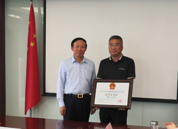 2019年5月15日,國家核安全局組織民用核安全設備許可證頒證儀式,并開展法人代表 “應知應會二十條”和質保部長核安全質保考試,重慶材料院法人代表、董事長、總經理劉慶賓,總經理助理、質量管理部部長胡偉參加并順利通過考試。國家核安全局郭承站局長向劉慶賓董事長頒發許可證。
