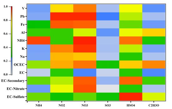 NH4+與OCEC粒子、EC-Sulfate和EC-Secondary的混合比較高,與EC-nitrate的混合程度較低,大氣中的氨更容易與有機物和硫酸鹽相結(jié)合。