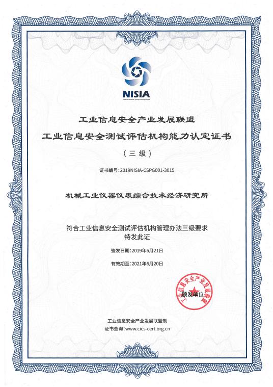 2019年6月21日,機械工業(yè)儀器儀表綜合技術(shù)經(jīng)濟研究所(以下簡稱“儀綜所”)獲得工業(yè)信息安全測試評估機構(gòu)能力認定證書。