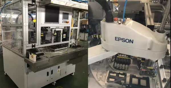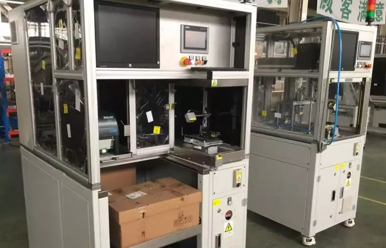 第二站為多工位轉(zhuǎn)臺形式,包含激光打標(biāo)、機(jī)器人自動下料、相機(jī)防錯檢測,進(jìn)行多種型號殼體壓合裝配。
