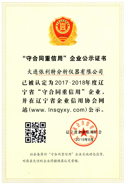 近日, 大連依利特分析儀器有限公司收到了遼寧省企業(yè)信用協(xié)會頒發(fā)的2017-2018年度遼寧省“守合同重信用”企業(yè)公示證書。這是該公司自2009年首次獲評后,第四次獲得此殊榮。