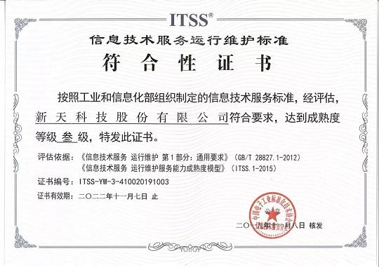 2019年10月22日至10月31日,中國電子工業標準化技術協會信息技術服務分會(ITSS分會)組織召開了《信息技術服務 運行維護服務能力成熟度模型》(以下稱運行維護服務能力成熟度)符合性評估專家評審會。根據專家評審會評審結果,ITSS分會于2019年11月1日至11月7日對擬授予符合性證書的單位名單進行了公示,根據公示結果及反饋意見對通過符合性評估的單位名單進行了最終確認。按照工業和信息化部組織制定的信息技術服務標準,經評估,新天科技股份有限公司符合要求達到成熟度等級叁級,獲得“ITSS信息技術服務運行維護標準符合性證書”。