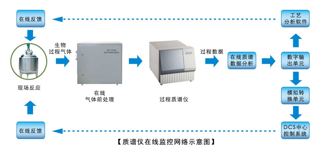 在線質(zhì)譜儀是在線、快速、多組分氣體成分高精度分析儀器,將在線質(zhì)譜儀用于生物過程領(lǐng)域,實現(xiàn)不同類型生物過程尾氣中 O2、CO2、N2、H2、乙醇、CO、Ar等氣體及其它可揮發(fā)分子組分的高精度、寬量程和長時間連續(xù)穩(wěn)定測量,得到氣體的種類(性質(zhì))和濃度變化等信息 ,并將數(shù)據(jù)輸入軟件或者 D CS 控制系統(tǒng)進行相關(guān)計算并實施連鎖控制。