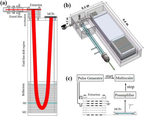 該團(tuán)隊(duì)唐小鋒副研究員和溫作贏博士等人,以真空紫外放電燈作為電離源,自行設(shè)計(jì)和研制了小型真空紫外光電離反射式飛行時間質(zhì)譜儀,并將之應(yīng)用于大氣自由基反應(yīng)動力學(xué)研究。通過設(shè)計(jì)具有籠式結(jié)構(gòu)的新型聚焦電場,實(shí)現(xiàn)了電離區(qū)內(nèi)離子的高效率收集,提高了質(zhì)譜儀的檢測靈敏度(自由基靈敏度達(dá)到0.3ppb)。同時,通過采用垂直引入式結(jié)構(gòu)和二級空間聚焦等關(guān)鍵技術(shù),實(shí)現(xiàn)小型化質(zhì)譜儀高的質(zhì)譜分辨本領(lǐng)(M/△M = 2000, FWHM)。