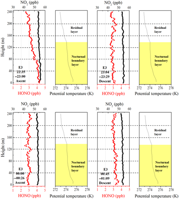 HONO作為OH自由基的重要前體物,其光解貢獻(xiàn)了日間25%–60%的OH自由基,在大氣光化學(xué)反應(yīng)過程中扮演著重要作用。盡管對大氣HONO的研究已有幾十年的歷史,其詳細(xì)的形成機(jī)理仍存在爭議,夜間地表面和氣溶膠表面的HONO生成仍是研究的熱點(diǎn)之一。因此,針對北京市高霧霾污染狀況,開展夜間HONO垂直梯度研究,研究不同污染階段夜間地表面和氣溶膠表面的HONO生成,對了解夜間大氣HONO生成機(jī)制具有重要意義。