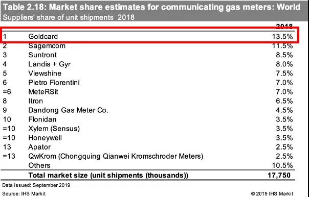 金卡智能已步入全球物聯(lián)網表計第一方陣。據HIS Markit統(tǒng)計,金卡智能燃氣終端全球市場占有率排名第一。