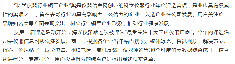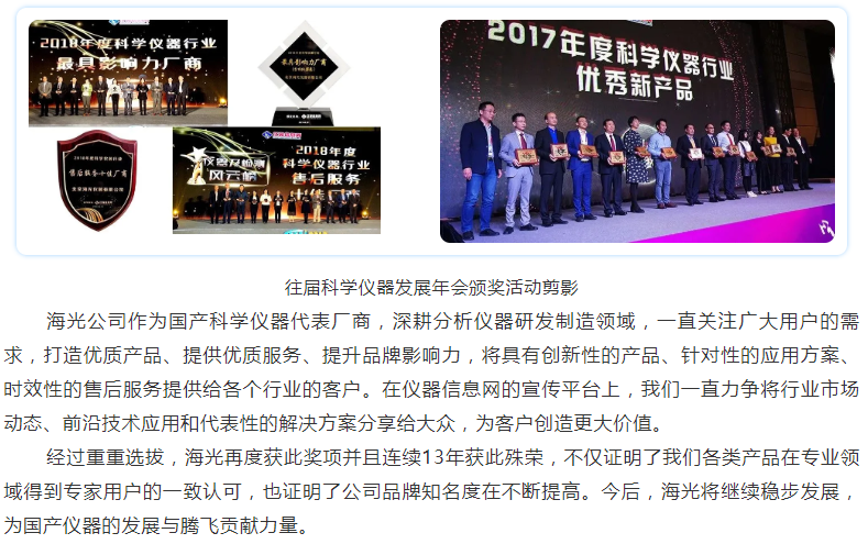 北京海光儀器有限公司是中國儀器儀表行業協會常務理事單位,主要從事分析儀器的研發、制造、銷售和售后服務, 是中國知名的光譜分析儀器制造廠商,連續十二年被媒體評為“最具影響力國內儀器廠商”稱號,公司通過了質量管理體系、環境管理體系、職業健康安全體系三大體系認證,公司以原子熒光光度計、原子吸收分光光度計、測汞儀、流動分析儀、快速溶劑萃取儀和等離子體發射光譜儀等分析儀器為主要產品,廣泛應用于食品藥品、環境監測、農業、質監、自來水、檢驗檢疫、地質、第三方檢測、科研等領域,產品獲得國家科技進步三等獎、七次BCEIA 金獎、自主創新金獎、國產好儀器等多種獎項。日前,2019年度“科學儀器行業領軍企業”(原“最具影響力廠商”)評選活動獲獎名單揭曉,北京海光儀器有限公司獲分析儀器類領軍企業稱號,也是連續十三年獲此殊榮。