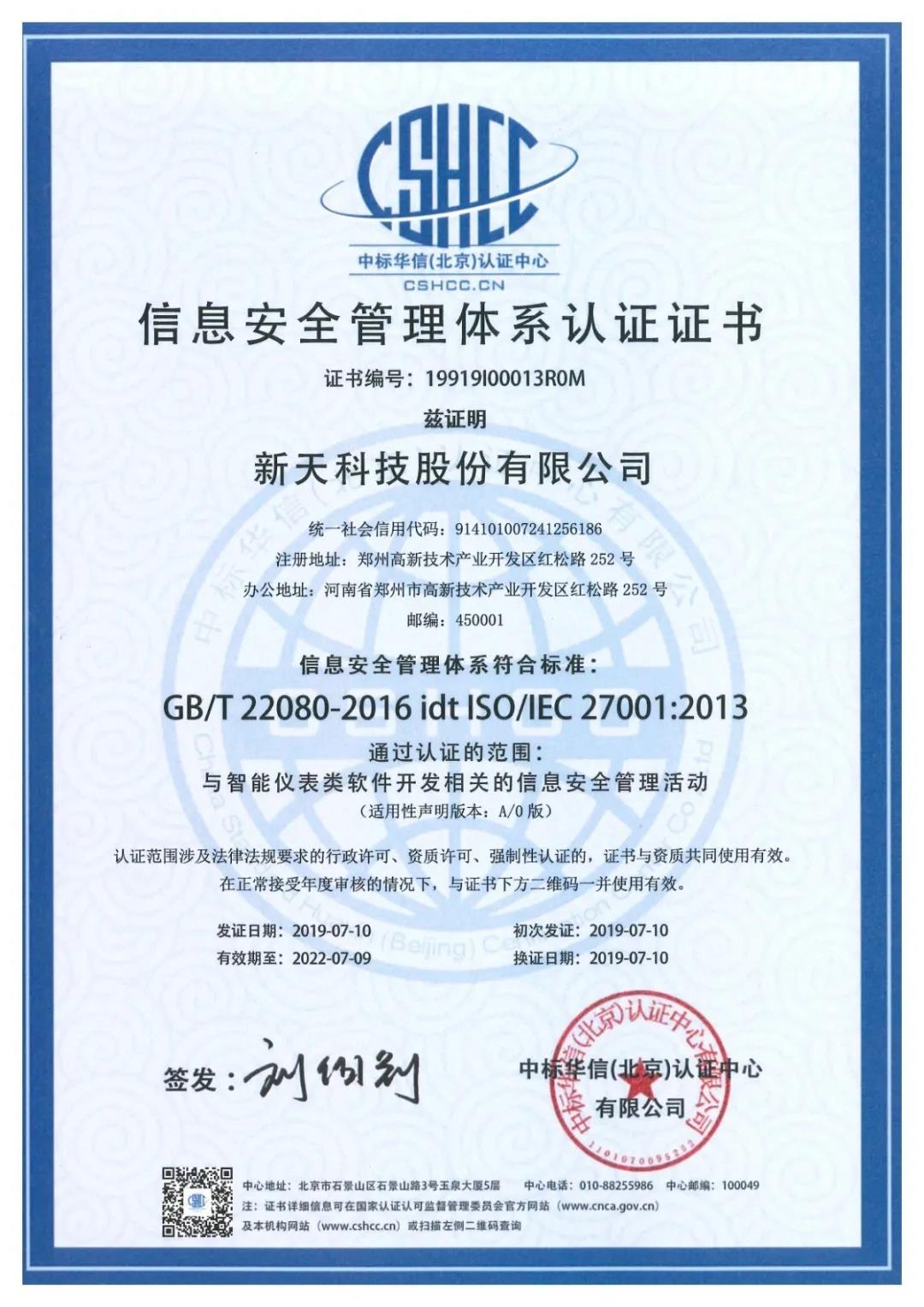 作為國內(nèi)著名的智能儀表品牌,新天科技不斷加大安全技術(shù)防范的投入,確保用戶隱私安全及運營系統(tǒng)穩(wěn)定。通過聚焦關(guān)鍵核心技術(shù),牢牢把握自主創(chuàng)新主動權(quán),吸引培育高端人才團隊,牢筑信息安全屏障。經(jīng)過多年的實踐和優(yōu)化,新天科技已建立起一套對標(biāo)國際的安全管理體系,并在近期通過了ISO27001認證。