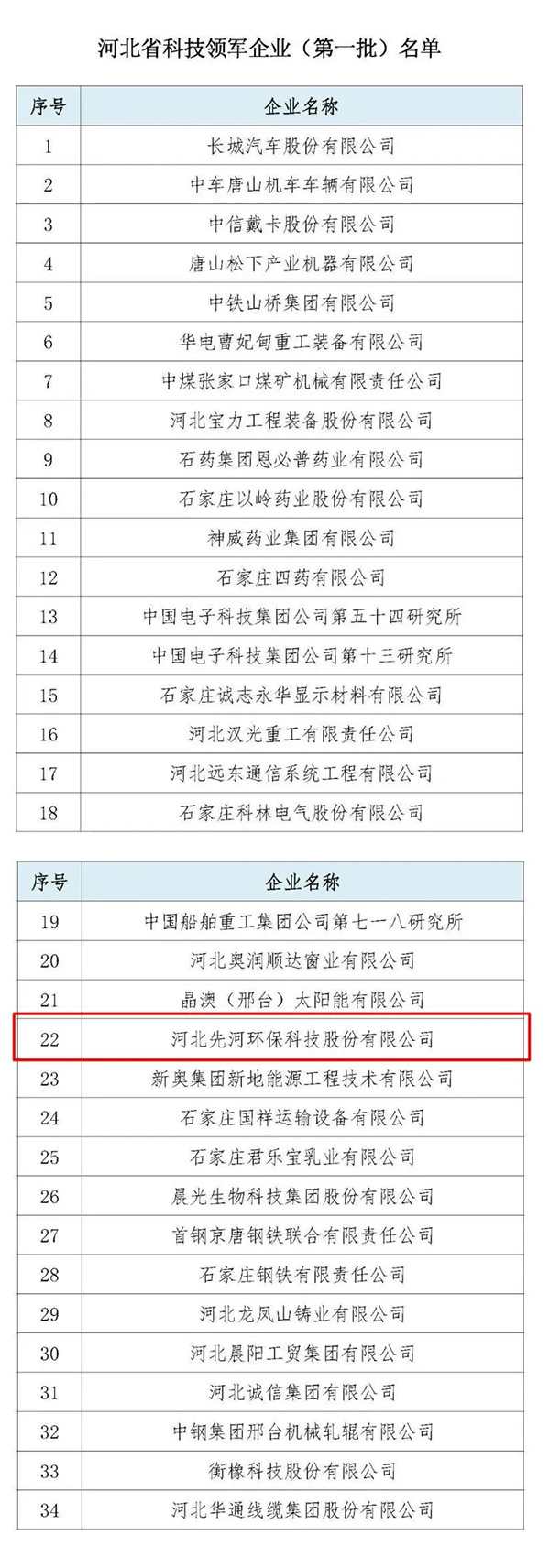 近日,河北省科學(xué)技術(shù)廳發(fā)布《關(guān)于認(rèn)定第一批河北省科技領(lǐng)軍企業(yè)的通知》。為促進全省科技領(lǐng)軍企業(yè)加快發(fā)展,按照《河北省科技領(lǐng)軍企業(yè)認(rèn)定管理辦法(試行)》有關(guān)規(guī)定,經(jīng)企業(yè)申報、歸口單位審核、專家評審和網(wǎng)上公示,認(rèn)定河北先河環(huán)保科技股份有限公司(以下簡稱先河環(huán)保)等34家企業(yè)為第一批河北省科技領(lǐng)軍企業(yè)。
