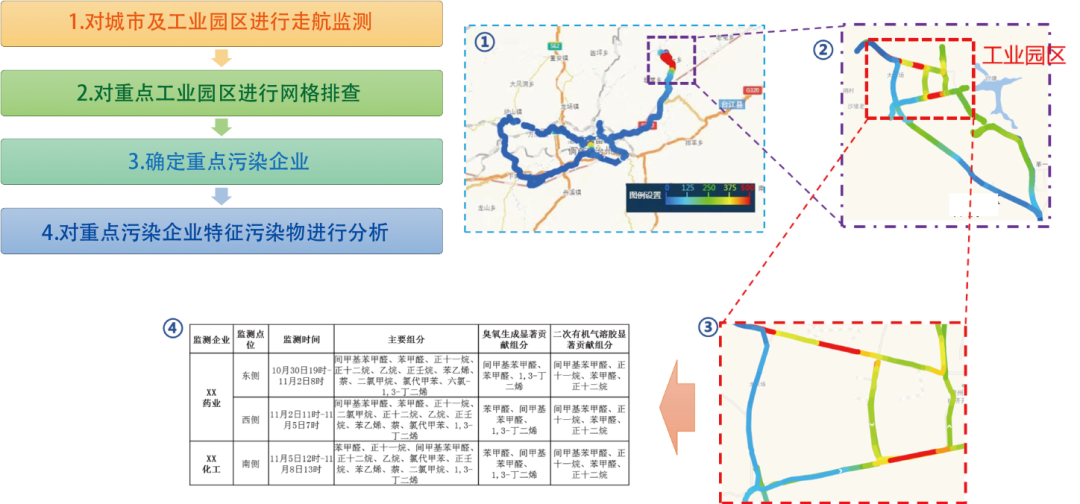 通過對城市環境空氣VOCs進行走航監測,發現高污染工業園區,對園區進行VOCs走航溯源分析,鎖定高排污企業后分析特征組分種類與污染水平,為精準治污提供科學依據。