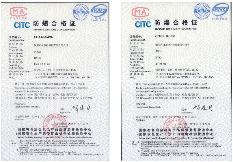 2020年10月28日,湖南聲儀測控所研發的HY128系列多功能聲級計,含HY128、HY128A、HY128B、HY128C四種型號產品,順利通過國家有色冶金機電產品質量監督檢測中心防爆認證,同時獲得本安防爆、礦用本安防爆合格證。這意味著該系列產品能進一步適應不同場所和不同環境下的廣泛應用,并且有更多型號和不同功能供客戶根據需要提供貼切選擇。