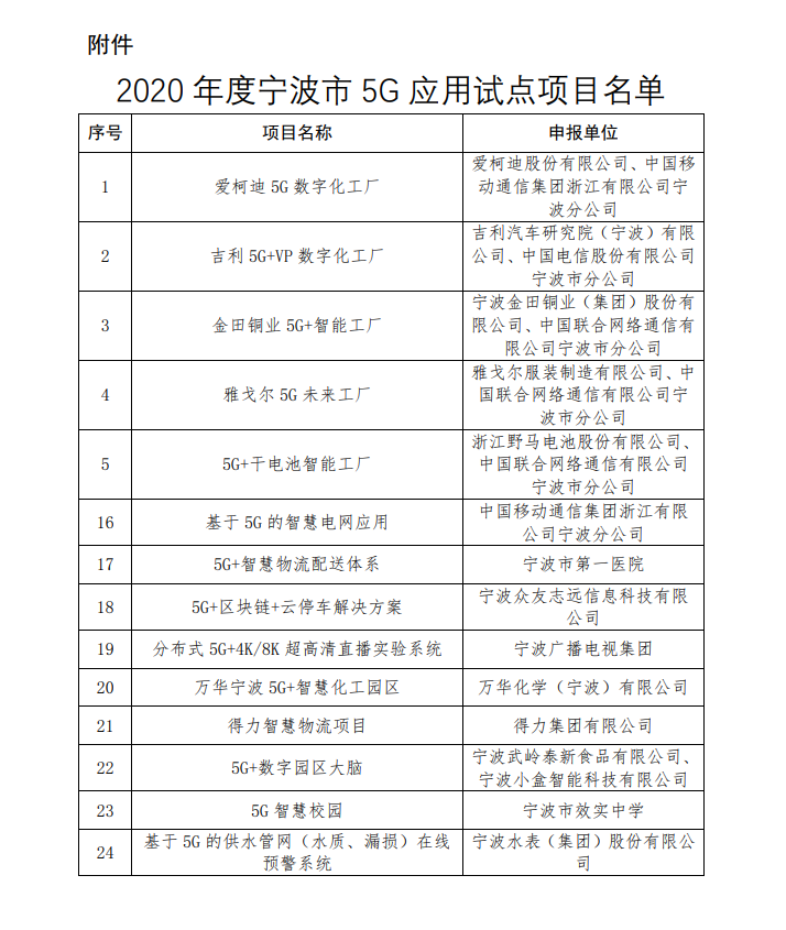根據(jù)《關(guān)于征集2020年寧波市5G應(yīng)用試點(diǎn)項(xiàng)目的通知》(甬經(jīng)信箋[2020]284號)要求,經(jīng)過單位申報(bào)、部門推薦、專家實(shí)地考察評審,寧波水表(集團(tuán))股份有限公司(以下簡稱:寧水集團(tuán))的“基于5G的供水管網(wǎng)(水質(zhì)、漏損)在線預(yù)警系統(tǒng)”等24個項(xiàng)目被列入2020年度寧波市5G應(yīng)用試點(diǎn)項(xiàng)目名單,并于2021年1月26日至2021年2月1日進(jìn)行了網(wǎng)上公示。該項(xiàng)目主要內(nèi)容有管網(wǎng)綜合感知終端/多參數(shù)水表(智能水表3.0產(chǎn)品)、5G通信終端、管網(wǎng)(水質(zhì)、漏損)在線預(yù)警平臺等關(guān)鍵技術(shù)的研制,以及工程化應(yīng)用等。
