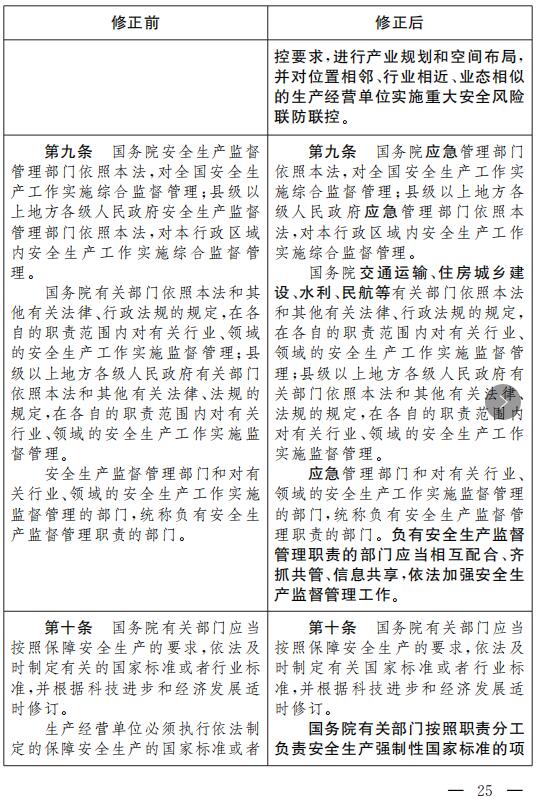 (二)將第九條第三款修改為:“應(yīng)急管理部門和對(duì)有關(guān)行業(yè)、領(lǐng)域的安全生產(chǎn)工作實(shí)施監(jiān)督管理的部門,統(tǒng)稱負(fù)有安全生產(chǎn)監(jiān)督管理職責(zé)的部門。負(fù)有安全生產(chǎn)監(jiān)督管理職責(zé)的部門應(yīng)當(dāng)相互配合、齊抓共管、信息共享,依法加強(qiáng)安全生產(chǎn)監(jiān)督管理工作?!?/span>