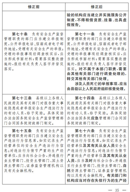 十七、將第七十條改為第七十一條,修改為:“負(fù)有安全生產(chǎn)監(jiān)督管理職責(zé)的部門應(yīng)當(dāng)建立舉報(bào)制度,公開舉報(bào)電話、信箱或者電子郵件地址,受理有關(guān)安全生產(chǎn)的舉報(bào);受理的舉報(bào)事項(xiàng)經(jīng)調(diào)查核實(shí)后,應(yīng)當(dāng)形成書面材料;需要落實(shí)整改措施的,報(bào)經(jīng)有關(guān)負(fù)責(zé)人簽字并督促落實(shí)。對(duì)不屬于本部門職責(zé),需要由其他有關(guān)部門進(jìn)行調(diào)查處理的,轉(zhuǎn)交其他有關(guān)部門處理。