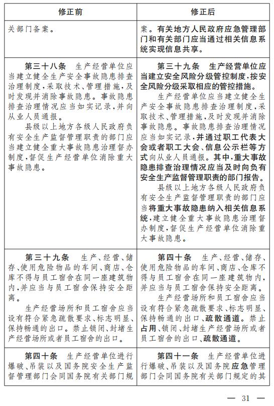 十一、將第三十八條改為第三十九條,修改為:“生產(chǎn)經(jīng)營(yíng)單位應(yīng)當(dāng)建立安全風(fēng)險(xiǎn)分級(jí)管控制度,按安全風(fēng)險(xiǎn)分級(jí)采取相應(yīng)的管控措施。