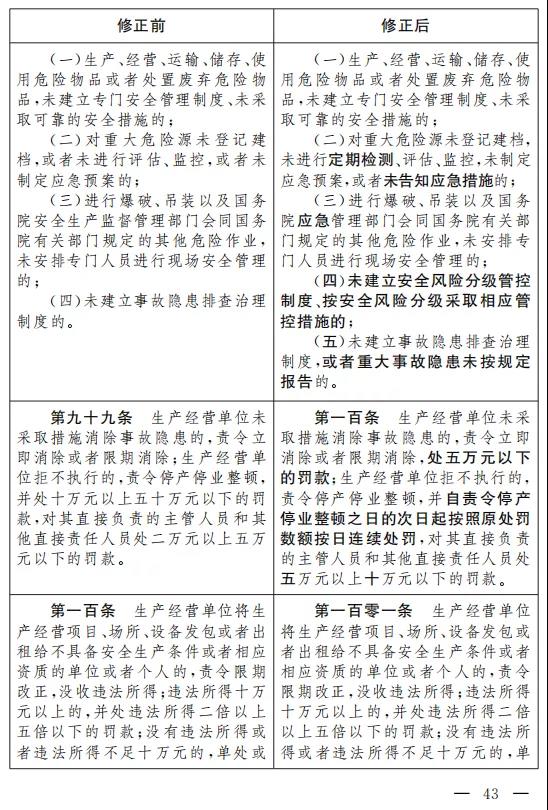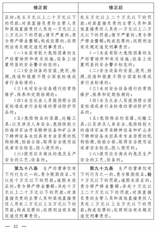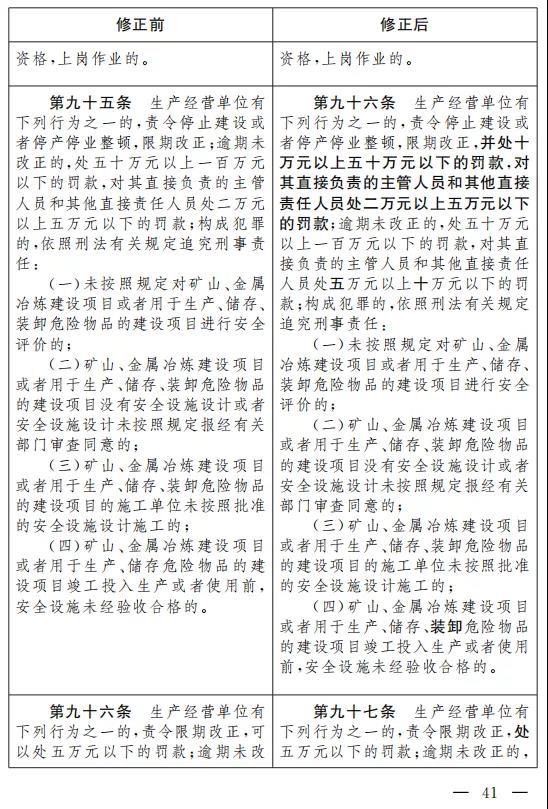 二十七、將第九十五條改為第九十六條,修改為:“生產(chǎn)經(jīng)營(yíng)單位有下列行為之一的,責(zé)令停止建設(shè)或者停產(chǎn)停業(yè)整頓,限期改正,并處十萬(wàn)元以上五十萬(wàn)元以下的罰款,對(duì)其直接負(fù)責(zé)的主管人員和其他直接責(zé)任人員處二萬(wàn)元以上五萬(wàn)元以下的罰款;逾期未改正的,處五十萬(wàn)元以上一百萬(wàn)元以下的罰款,對(duì)其直接負(fù)責(zé)的主管人員和其他直接責(zé)任人員處五萬(wàn)元以上十萬(wàn)元以下的 罰款;構(gòu)成犯罪的,依照刑法有關(guān)規(guī)定追究刑事責(zé)任: