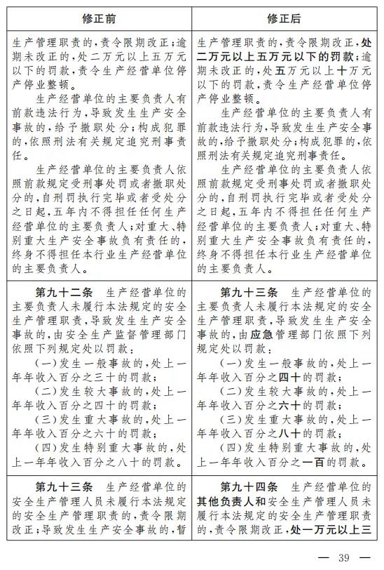 二十三、將第九十一條改為第九十二條, 第一款修改為:“生產(chǎn)經(jīng)營(yíng)單位的主要負(fù)責(zé)人未履行本法規(guī)定的安全生產(chǎn)管理職責(zé)的,責(zé)令限期改正,處二萬(wàn)元以上五萬(wàn)元以下的罰款;逾期未改正的,處五萬(wàn)元以上十萬(wàn)元以下的罰款,責(zé)令生產(chǎn)經(jīng)營(yíng)單位停產(chǎn)停業(yè)整頓?!?/span>
