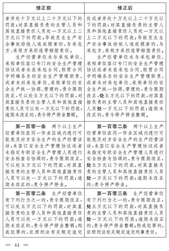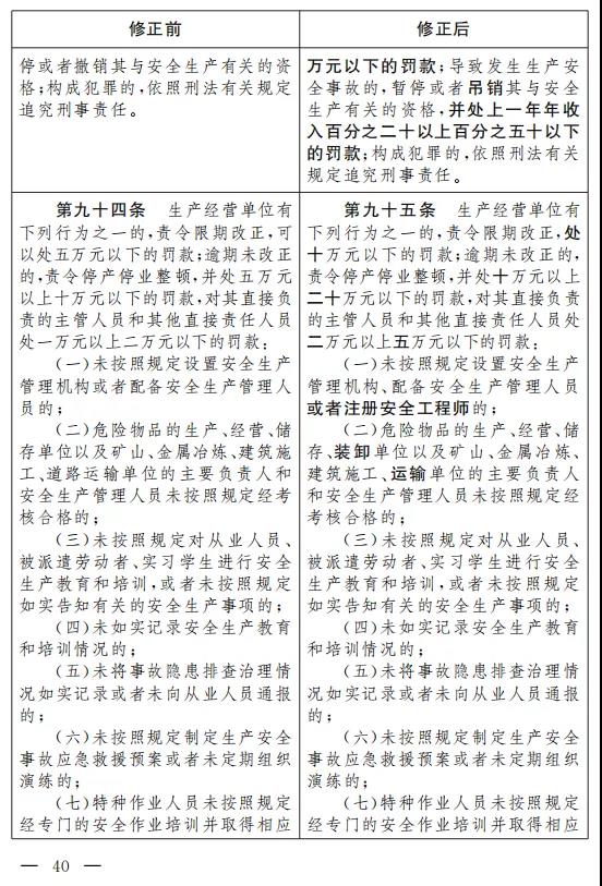 二十六、將第九十四條改為第九十五條,修改為:“生產(chǎn)經(jīng)營(yíng)單位有下列行為之一的, 責(zé)令限期改正, 處十萬(wàn)元以下的罰款;逾期未改正的,責(zé)令停產(chǎn)停業(yè)整頓,并處十萬(wàn)元以上二十萬(wàn)元以下的罰款,對(duì)其直接負(fù)責(zé)的主管人員和其他直接責(zé)任人員處二萬(wàn)元以上五萬(wàn)元以下的罰款: