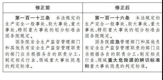 三十六、將第一百一十三條改為第一百一十六條,第二款修改為:“國(guó)務(wù)院應(yīng)急管理部門和其他負(fù)有安全生產(chǎn)監(jiān)督管理職責(zé)的部門應(yīng)當(dāng)根據(jù)各自的職責(zé)分工,制定相關(guān)行業(yè)、領(lǐng)域重大危險(xiǎn)源的辨識(shí)標(biāo)準(zhǔn)和重大事故隱患的判定標(biāo)準(zhǔn)。”