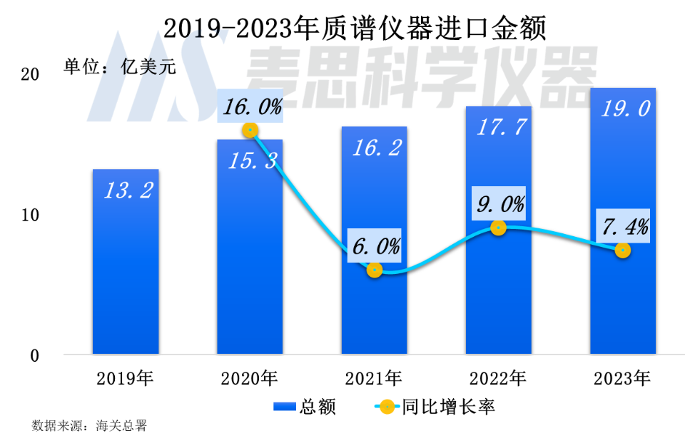 2023年我國質(zhì)譜儀器(含質(zhì)譜聯(lián)用儀和其他質(zhì)譜儀)進(jìn)口金額達(dá)19.0億美元(約合人民幣133億元),同比上升7.4%。進(jìn)口質(zhì)譜需求依然旺盛。