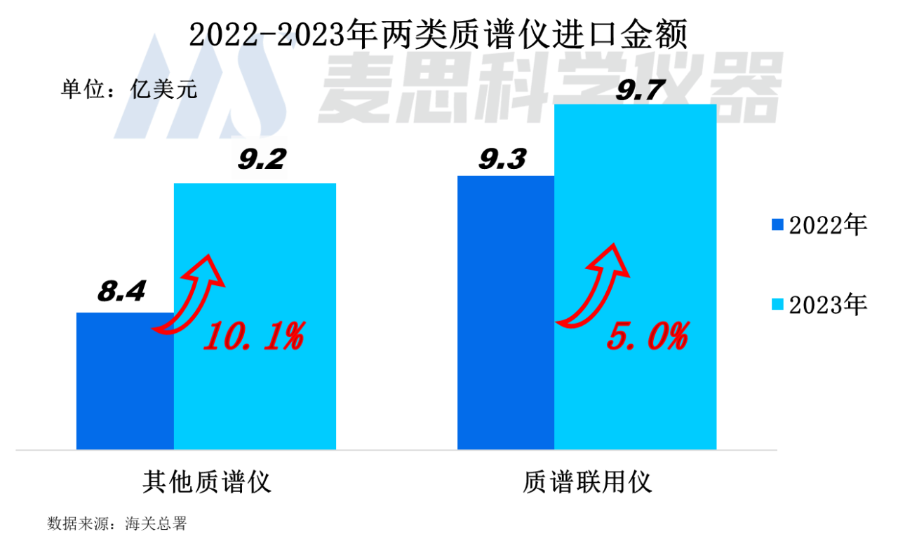 2023年其他質(zhì)譜儀的進(jìn)口金額為9.2億美元,較2022年同比增長了10.1%。質(zhì)譜聯(lián)用儀進(jìn)口金額達(dá)9.7億美元,較2022年增長5.0%。兩類質(zhì)譜儀進(jìn)口規(guī)模均呈現(xiàn)正增長。
