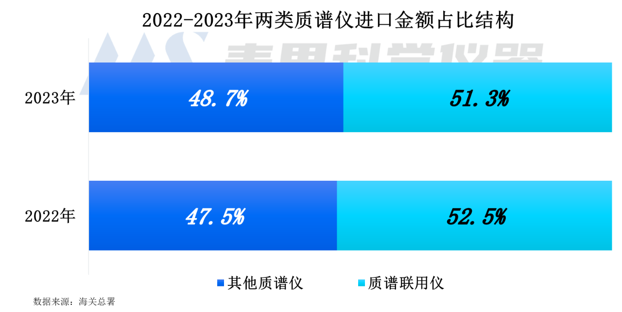 2023年質(zhì)譜聯(lián)用儀的進(jìn)口金額占比達(dá)51.3%,與上年相比減少1.2個百分點;其他質(zhì)譜儀的占比為48.7%。從兩類質(zhì)譜儀的金額占比結(jié)構(gòu)看,質(zhì)譜聯(lián)用儀的進(jìn)口需求更旺盛,但兩類質(zhì)譜儀的份額差距在縮小。
