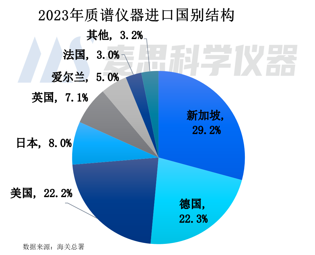 從2023年質(zhì)譜儀器進(jìn)口國別結(jié)構(gòu)看,排名前五位為新加坡、德國、美國、日本以及英國,進(jìn)口金額占比分別為29.2%、22.3%、22.2%、8.0%以及7.1%。