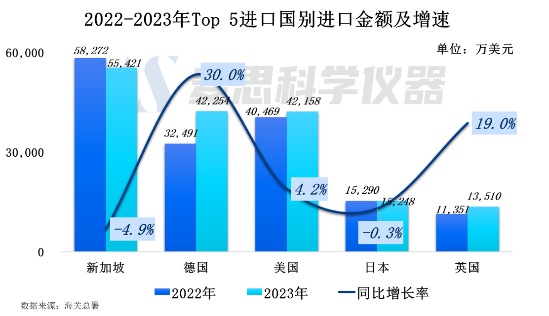 對比Top5國別2022年及2023年進(jìn)口金額,從德國、美國、英國進(jìn)口的質(zhì)譜儀器金額呈現(xiàn)正增長,其中德國最為明顯,同比增速達(dá)30.0%。而新加坡和日本的進(jìn)口金額則有輕微下降趨勢,同比下滑4.9%和0.3%。