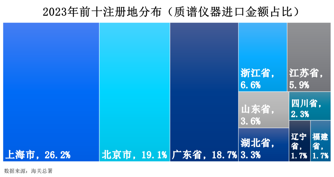 2023年質(zhì)譜儀器進(jìn)口額前十注冊地分別為上海市、北京市、廣東省、浙江省、江蘇省、山東省、湖北省、四川省、遼寧省以及福建省,占比分別為26.2%、19.1%、18.7%、6.6%、5.9%、3.6%、3.3%、2.3%、1.7%以及1.7%。