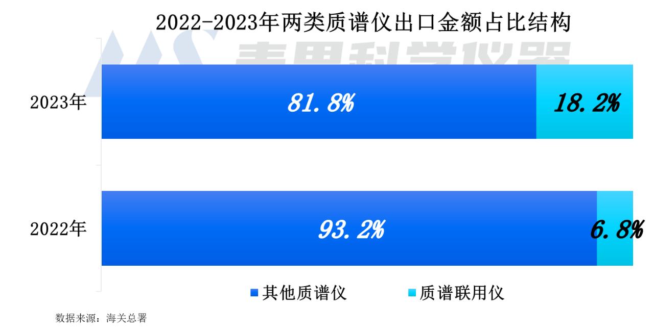 質(zhì)譜聯(lián)用儀的需求大幅增加。2023年質(zhì)譜聯(lián)用儀出口金額為1900萬美元,較2022年增長125.8%。質(zhì)譜聯(lián)用儀的出口金額占比增至18.2%,同比增加11.4個百分點。