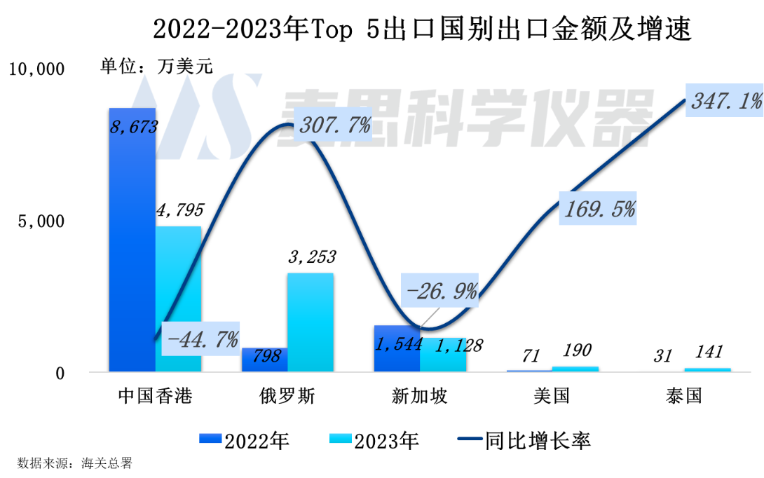 從2023年質(zhì)譜儀器出口國別結(jié)構(gòu)看,排名前五位為中國香港(轉(zhuǎn)口貿(mào)易)、俄羅斯、新加坡、美國以及泰國,出口金額占比分別為45.6%、30.9%、10.7%、1.8%以及1.3%。