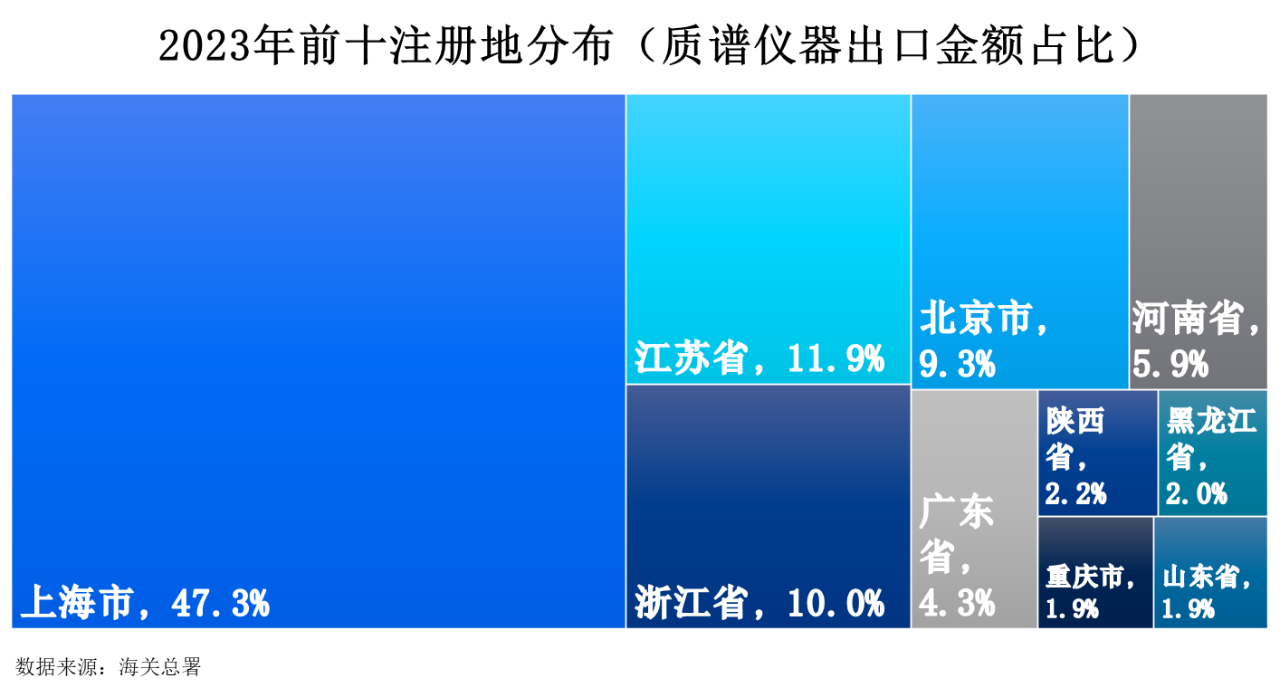 2023年質(zhì)譜儀器出口額前十注冊地分別為上海市、江蘇省、浙江省、北京市、河南省、廣東省、陜西省、黑龍江省、重慶市和山東省,占比分別為47.3%、11.9%、10.0%、9.3%、5.9%、4.3%、2.2%、2.0%、1.9%和1.9%。