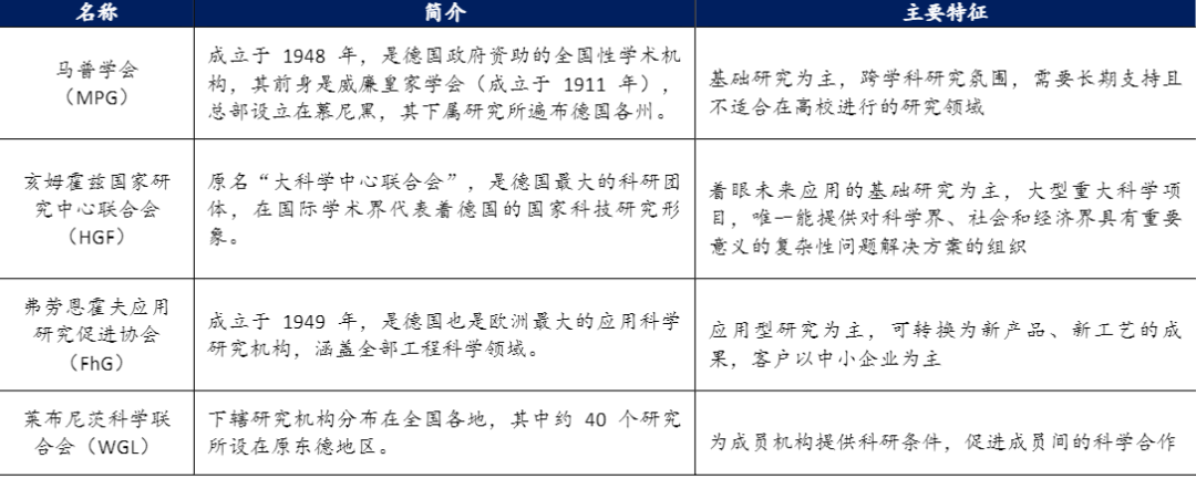 除弗勞恩霍夫協會外,德國還有馬普學會、亥姆霍茲國家研究中心聯合會和萊布尼茨科學聯合會三大國家科研組織,分別在基礎研究、未來應用研究、促進研究機構間的科學溝通等領域發揮作用。四大骨干科研組織為戰后德國工業的發展起到了重要的支撐作用。