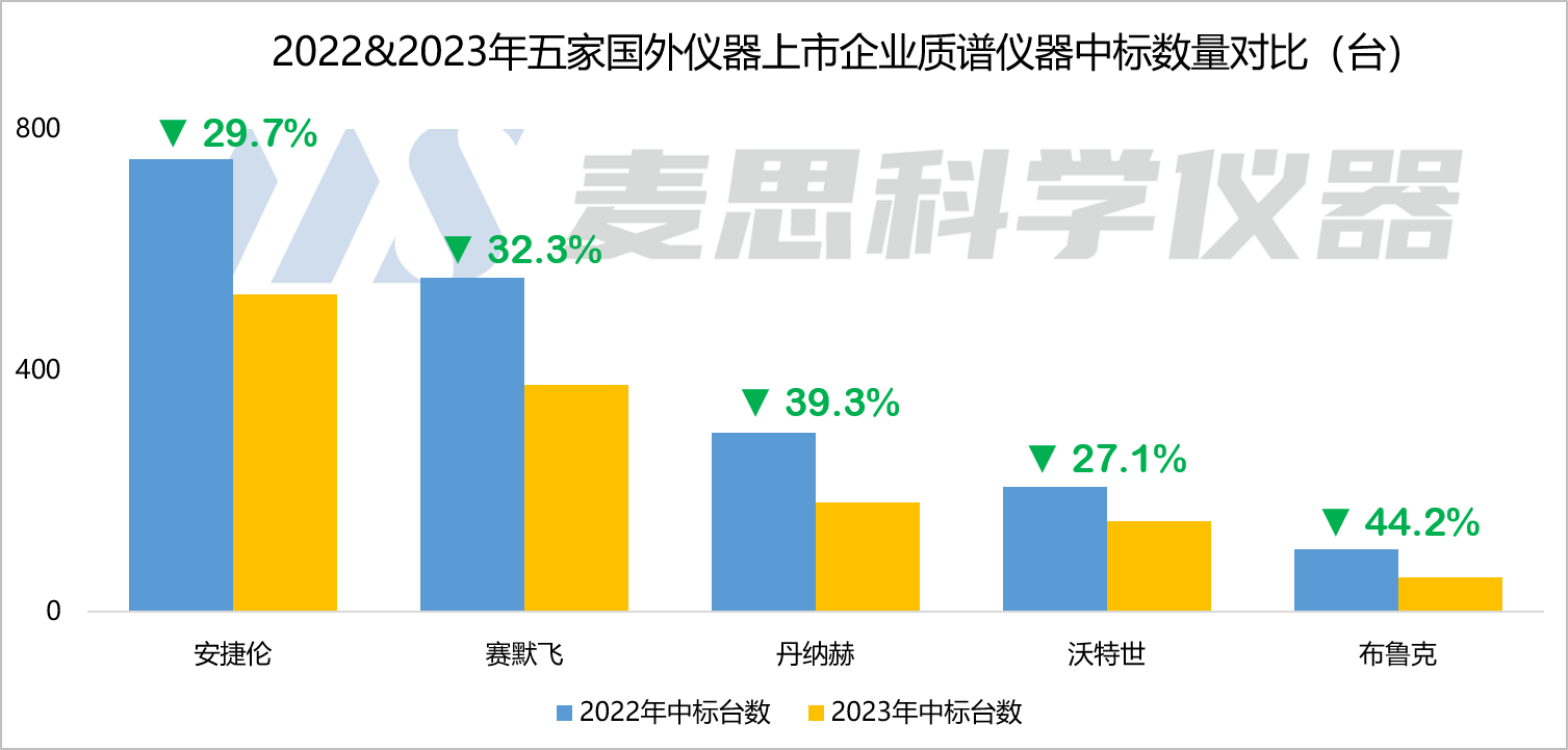 從中標數據來看,雖然2023年上述五家國外企業進入了中國質譜儀器中標市場的TOP 10廠商行列,但他們中標數量和中標金額同比都有比較明顯的下降。