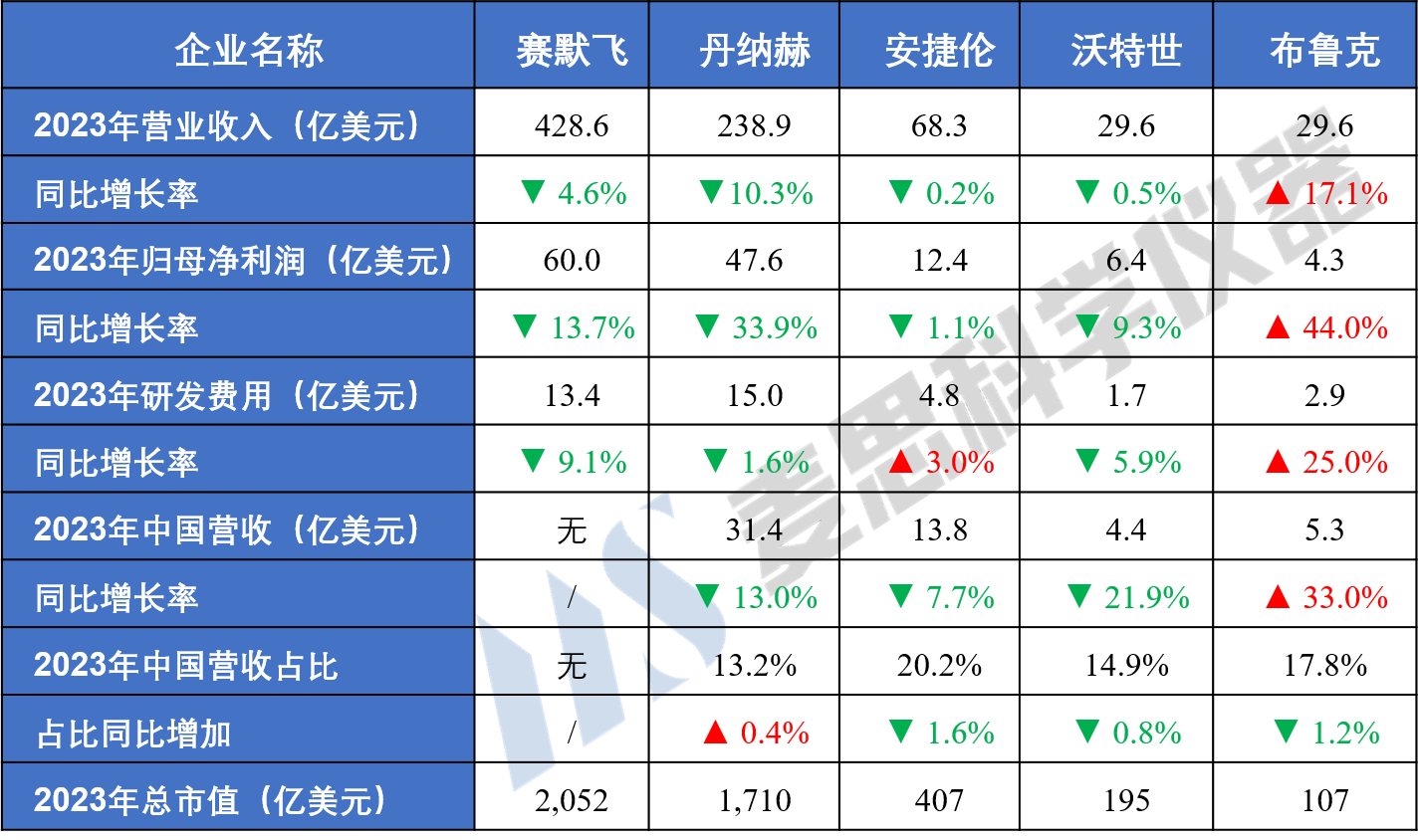 截至20242月,賽默飛、丹納赫、安捷倫、沃特世和布魯克已發布2023年年報。重點財務數據如下: