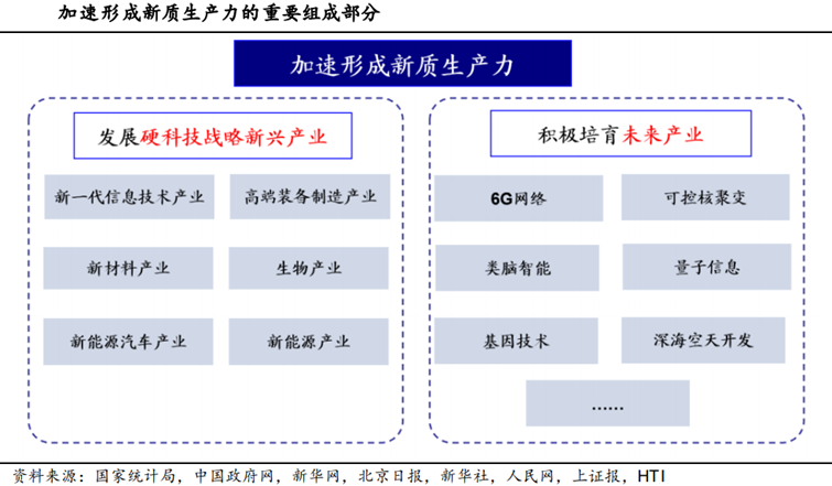 新質(zhì)生產(chǎn)力的核心在于整合科技創(chuàng)新資源,一方面引領(lǐng)發(fā)展戰(zhàn)略性新興產(chǎn)業(yè),國家統(tǒng)計局發(fā)布的《戰(zhàn)略性新興產(chǎn)業(yè)分類(2018)》中有新一代信息技術(shù)產(chǎn)業(yè)、高端裝備制造產(chǎn)業(yè)、新材料產(chǎn)業(yè)、生物產(chǎn)業(yè)、新能源汽車產(chǎn)業(yè)、新能源產(chǎn)業(yè)六大產(chǎn)業(yè)和硬科技的概念不謀而合;另一方面積極培育未來產(chǎn)業(yè),在6G網(wǎng)絡(luò)、可控核聚變、類腦智能、量子信息、基因技術(shù)、深海空天開發(fā)等前沿科技和產(chǎn)業(yè)變革領(lǐng)域贏得發(fā)展主動權(quán),從而以硬科技創(chuàng)新帶動新經(jīng)濟(jì)增長點不斷涌現(xiàn)。