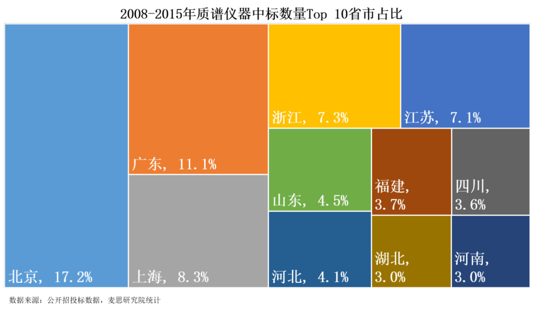 從地理區域分布來看,北京、廣東、上海、浙江和江蘇是2008-2015年間質譜儀器的五大采購區域,這些地區的中標數量合計占全國市場的一半以上。