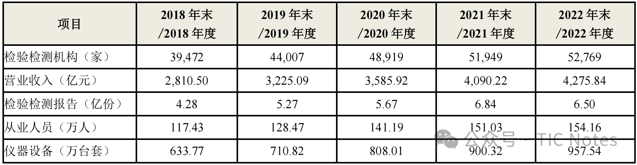 我國檢驗檢測服務業現已覆蓋建筑工程、環保、衛生、農業、質檢、食品、藥品、機械、電子、輕工、紡織、航空等國民經濟各個領域,根據國家市場監督管理總局于 2023 6 月發布的《2022 年度全國檢驗檢測服務業統計簡報》(以下簡稱“統計簡報”),我國檢驗檢測行業規模繼續擴大;2022 年末,獲得資質認定的各類檢驗檢測機構 52,769 家,較 2021 年末增長 1.58%2022 年度實現營業收入 4,275.84 億元,較 2021 年度增長 4.54%2022 年度共向社會出具檢驗檢測報告 6.50 億份,較 2021 年度下降 4.97%