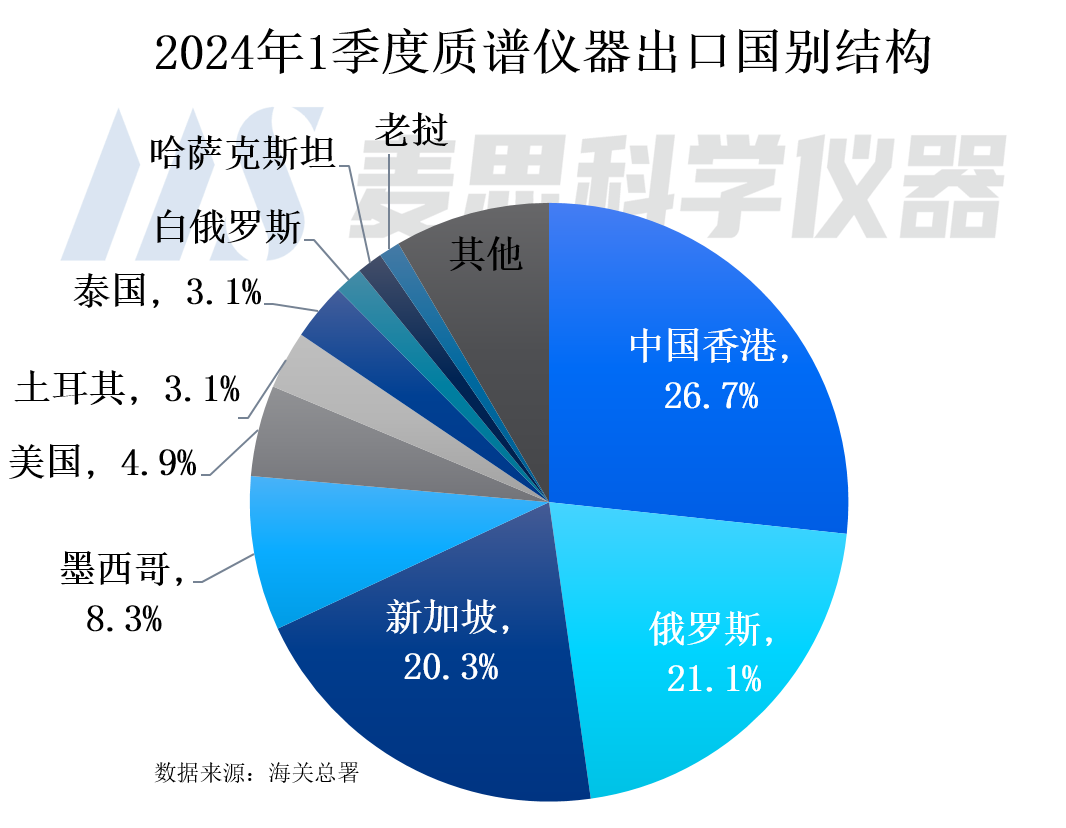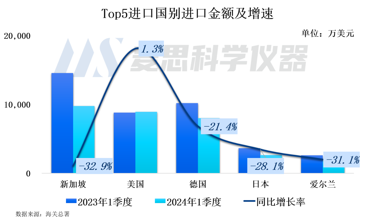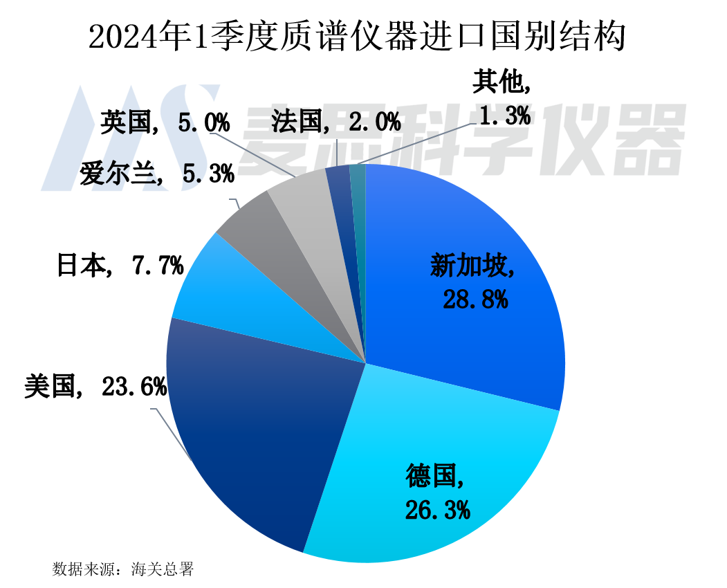 20241季度質譜儀器進口國別結構看,排名前五位為新加坡、德國、美國、日本以及愛爾蘭,進口金額占比分別為28.8%、26.3%、23.6%、7.7%以及5.3%。