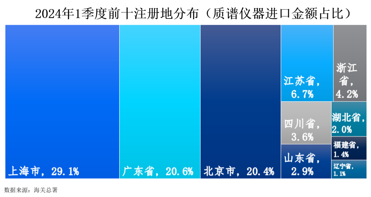 20241季度,中國質譜儀器進口額最高的注冊地依次為上海市、廣東省和北京市,分別以29.1%20.6%20.4%的占比位居前三。緊隨其后的是江蘇省和浙江省,占比分別為6.7%4.2%。四川省、山東省、湖北省、福建省以及遼寧省的進口額占比分別為3.6%2.9%2.0%、1.4%1.1%。