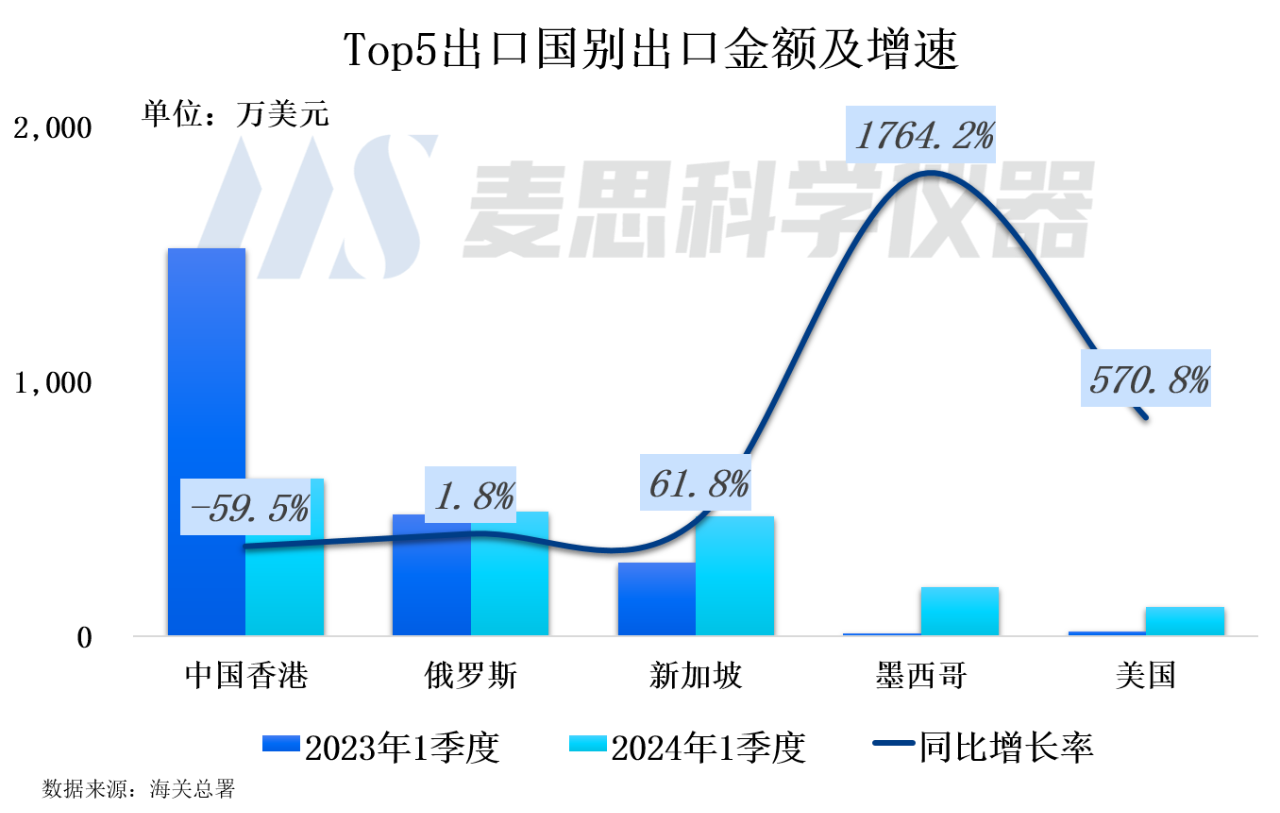 中國質譜儀器的出口主要集中在“其他質譜儀器”類別,20241季度出口額為1800萬美元,同比下降了25%。與此同時,質譜聯用儀的出口額約為500萬美元,與去年同期相比增長了84%,盡管增速顯著,但由于其基數較小,實際增長額僅為240萬美元。