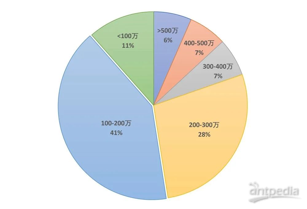 分子互作儀作為重要的生命科學儀器,其價格相對較高,基本設在百萬級。從本次統計來看,超過500萬中標金額的儀器僅一個型號,即思拓凡的Biacore 8K200萬到500萬之間共計25臺,8種型號,包括思拓凡的Biacore 1S+Biacore 1K;諾坦普的 DianthusPrometheus PantaMonolith;賽多利斯的OCTET RH16Octet R8Octet R4200萬以下共32臺,共計12種型號。其中100萬到200萬是眾多單位的預算區間,共計25次中標。