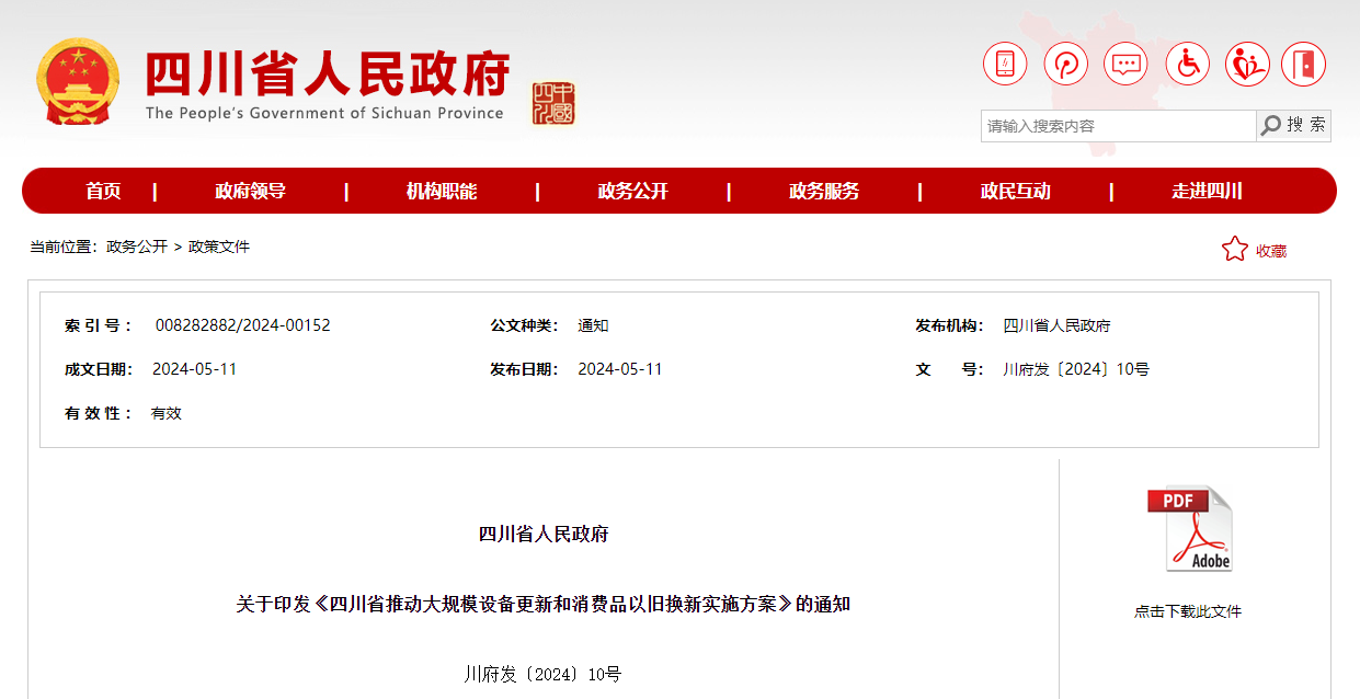 5月11日四川省人民政府網(wǎng)站發(fā)布關(guān)于印發(fā)《四川省推動大規(guī)模設(shè)備更新和消費品以舊換新實施方案》的通知。