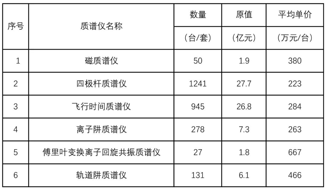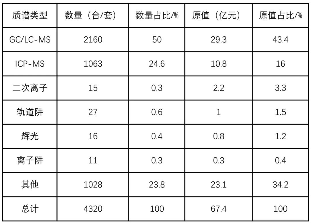 表6 2021年海關進口不同類型質譜儀器數量