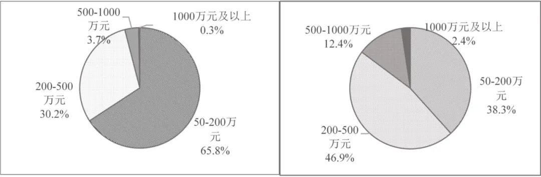 圖2 不同原值區間質譜儀器數量(左、臺/套)與原值(右、億元)分布