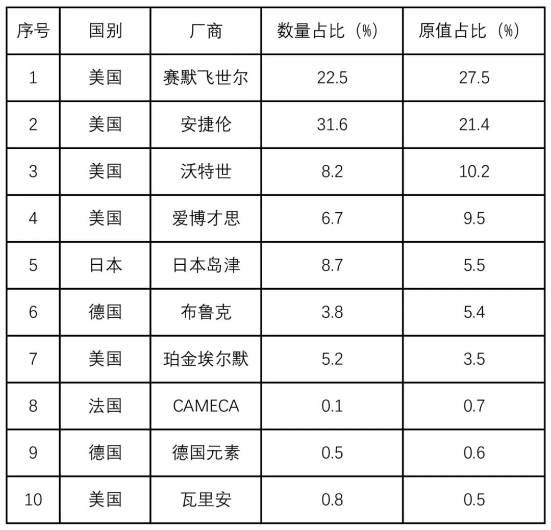 表5 購置儀器原值總額排名前十位的廠商