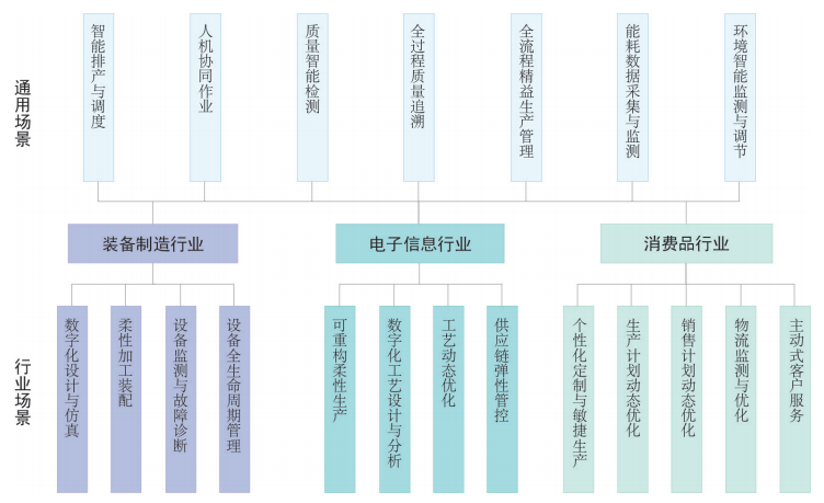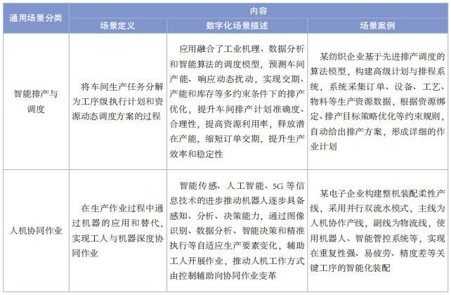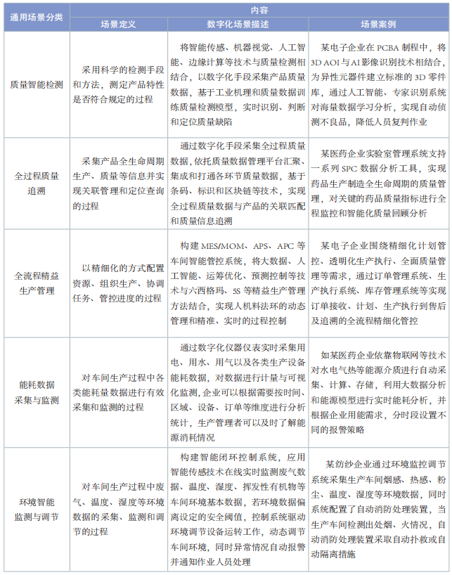 通用場(chǎng)景是指滿(mǎn)足不同行業(yè)數(shù)字化轉(zhuǎn)型共性需求的場(chǎng)景,具備在同行業(yè)內(nèi)及不同行業(yè)間的推廣價(jià)值。通用場(chǎng)景部分整理了裝備制造、電子信息和消費(fèi)品 3 個(gè)行業(yè)存在共性需求和相似解決方案的數(shù)字化典型場(chǎng)景,包括智能排產(chǎn)與調(diào)度、人機(jī)協(xié)同作業(yè)、質(zhì)量智能檢測(cè)、全過(guò)程質(zhì)量追溯、全流程精益生產(chǎn)管理、能耗數(shù)據(jù)采集與監(jiān)測(cè)、環(huán)境智能監(jiān)測(cè)與調(diào)節(jié) 7個(gè)場(chǎng)景,場(chǎng)景內(nèi)容見(jiàn)表 1。